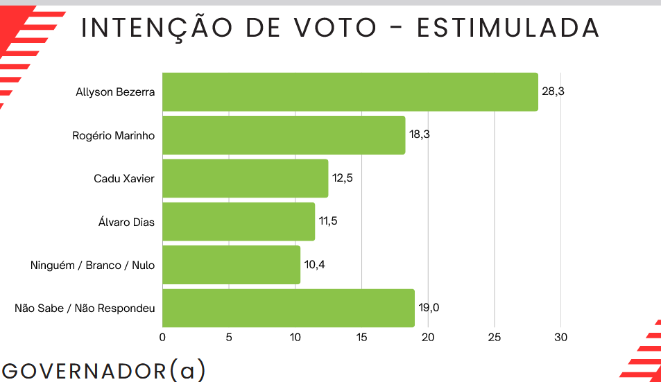 Allyson Bezerra também lidera a pesquisa estimulada para o Governo do Estado em Brejinho. Ele aparece com 28,3% e Rogério Marinho com 18,3%. Em seguida aparece Cadu Xavier com 12,5%