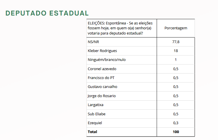 Pesquisa Seta mostrou a liderança de Kleber Rodrigues na preferência para deputado estadual em Brejinho. Em seguida o mais citado foi Coronel Azevedo.