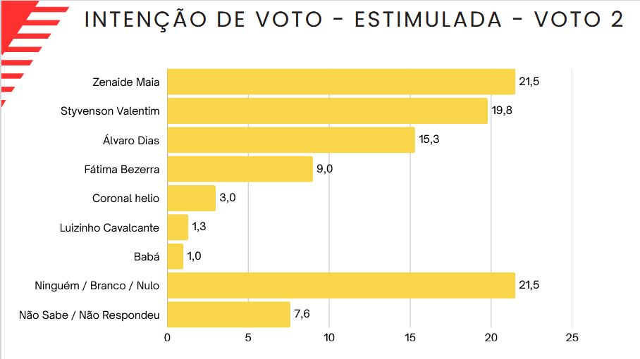 Pesquisa em Touros feita pelo Seta mostrou a liderança de Zenaide Maia no questionamento estimulado para o segundo voto de senador. Ela aparece com 21,% e em seguida Styvenson Valentim com 19,8%.
