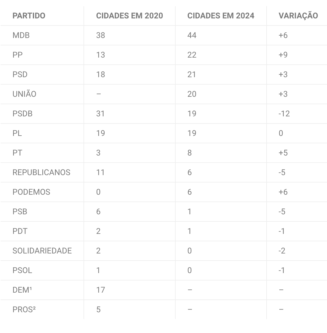 O Movimento Democrático Brasileiro (MDB) é a sigla que lidera o ranking em número de cidades, com 44 municípios sob a legislatura de um prefeito emedebista. O número é o dobro do segundo colocado, o Progressistas (PP), que possui 22 municípios, seguido pelo Partido Social Democrático (PSD) com 21, União Brasil (UNIÃO) com 20, e um empate entre o Partido Social da Democracia Brasileira (PSDB) e o Partido Liberal (PL), com 19 municípios cada.