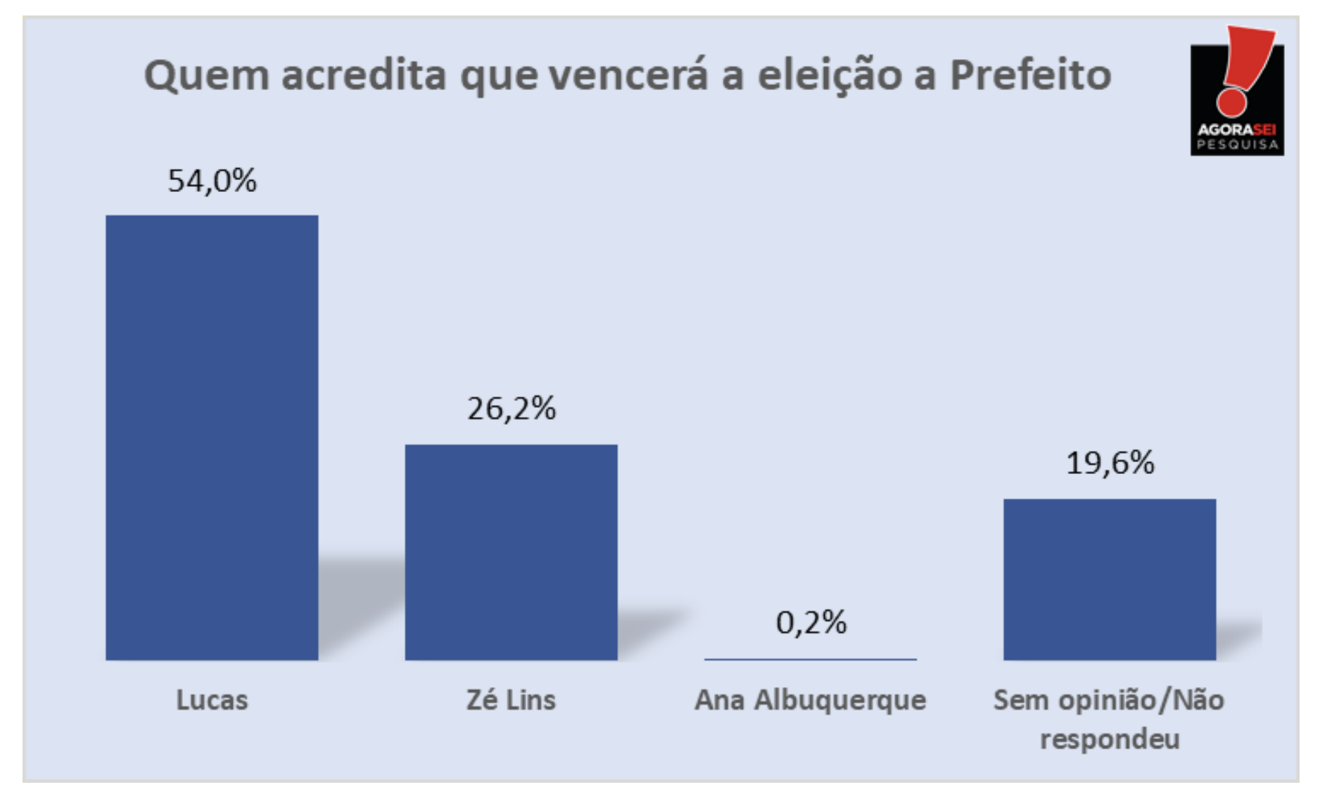 A pesquisa AgoraSei em Currais Novos questionou sobre quem as pessoas acreditam que vencerá o processo eleitoral, independente de em quem elas votam. 54% responderam que Lucas vencerá e outros Zé Lins afirmaram Zé Lins. 0,2% foi Ana Albuquerque e 19,6% não respondeu ou é sem opinião.