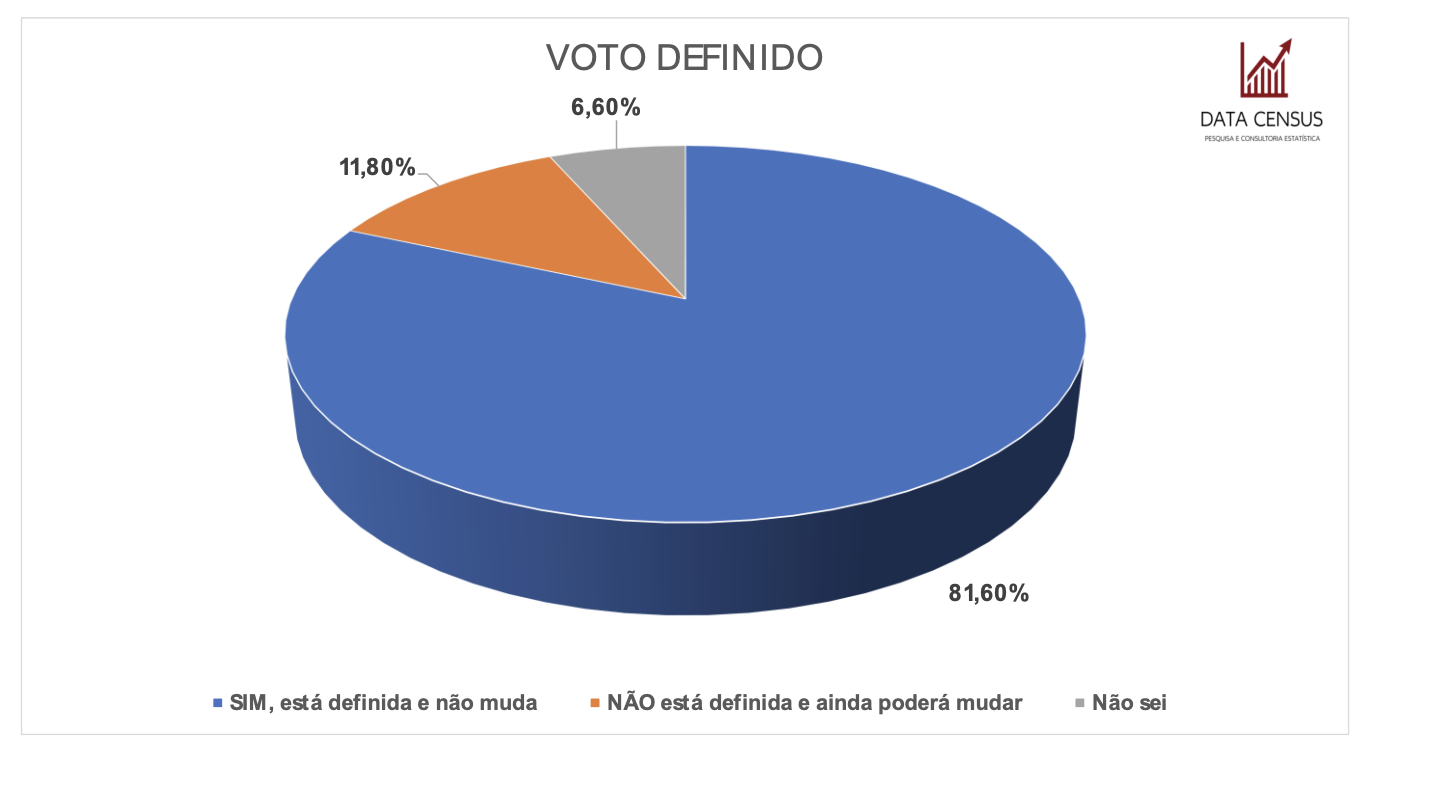 A pesquisa Data Census questionou o eleitorado de São Gonçalo sobre a convicção do voto. 81,6% dos entrevistados afirmaram não mudar o voto. E 11,8% admite mudar o voto. 6,6% não sabe.