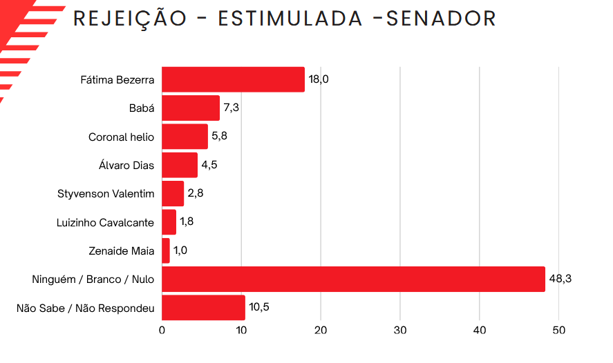 Pesquisa Seta no eleitorado de Touros mostrou que Fátima Bezerra é a mais rejeitada para o Senado. Ela aparece com 18% das pessoas afirmando que não votariam nela de jeito nenhum. Em seguida vem Babá com 7,3%.