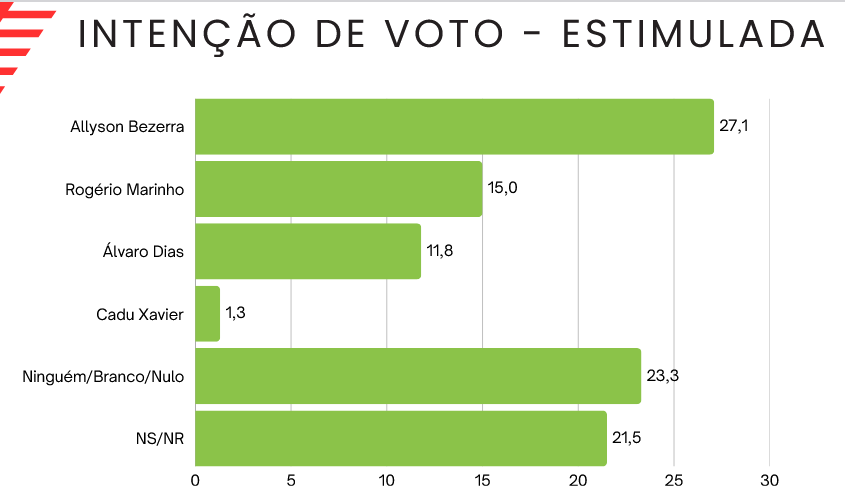 Pesquisa Seta em São José do Mipibu mostrou que o prefeito de Mossoró Allyson Bezerra lidera na estimulada. Ele aparece com 27,1% e em segundo lugar está Rogério Marinho com 15%. Em seguida vem Álvaro Dias com 11,8%.