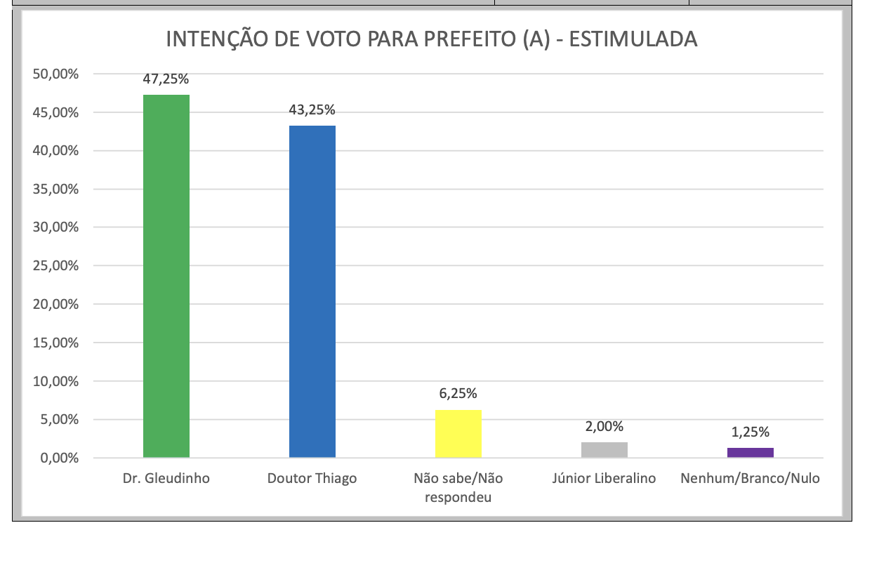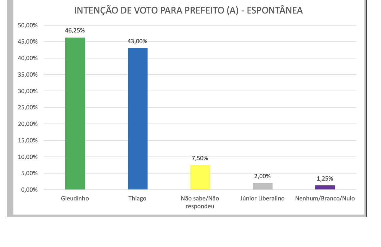 Na pesquisa espontânea a liderança também é de dr. Gleudinho com 46,25%. Dr. Thiago tem 43% e Júnior Liberalino 2%. 7,5% dos entrevistados afirmaram não saber ou preferiram não responder. Já 1,25% disse votar nenhum, branco ou nulo.