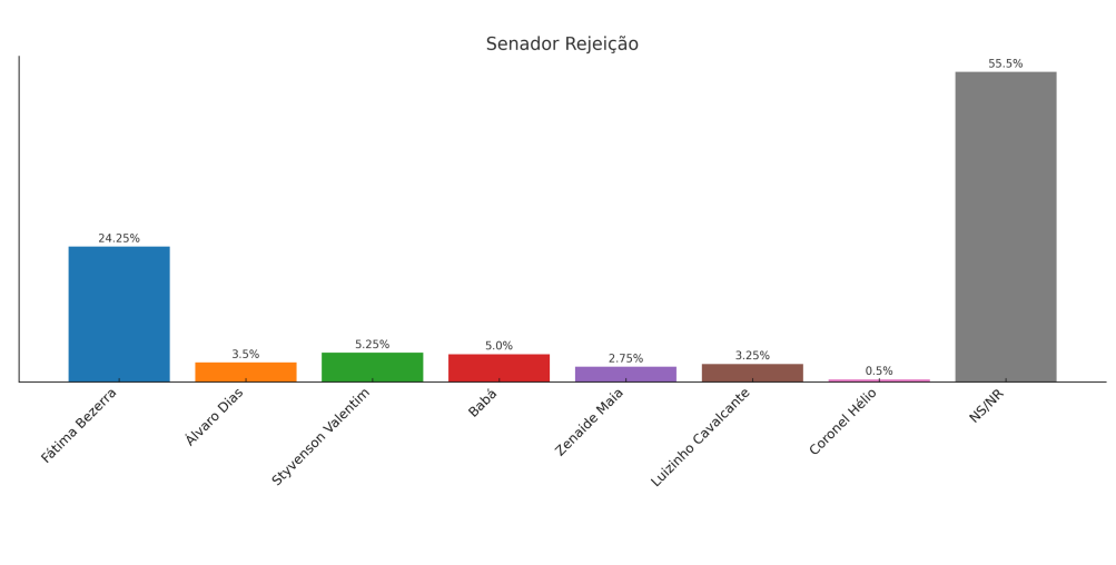 Pesquisa realizada em Santo Antonio, pela Seta, mostrou que Fátima Bezerra é a mais rejeitada para o Senado. Ela aparece com 24,25%. Em seguida vem Styvenson com 5,25%.