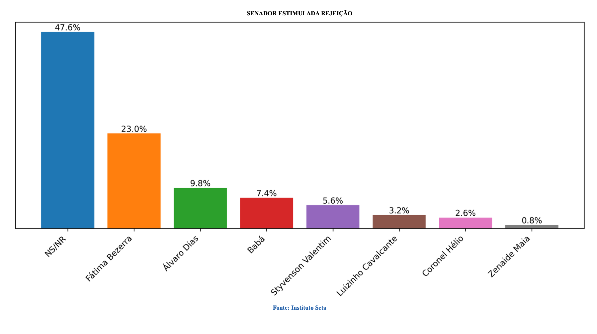A pesquisa Seta em São Gonçalo do Amarante apontou que, entre os candidatos ao Senado, Fátima Bezerra é a mais rejeitada. Ela tem 23%, seguida de Álvaro Dias com 9,8%.
