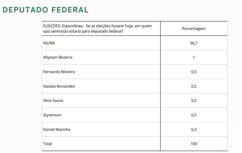 Pesquisa Seta realizada em São José do Mipibu mostra as intenções de votos para deputada federal.